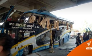 事故は2022年3月12日の15時ごろ、ローイエット(จ.ร้อยเอ็ด)からバンコク-スワンナプーム行きの白と青の2階建てツアーバースが、サラブリーのロビンソン前の立体交差のある橋の支柱に衝突したというものです。