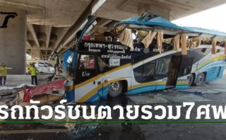 バンコク-スワンナプーム行きのツアーバスが、サラブリのロビンソンの前のミットラパープ通りにある立体交差の橋の支柱に衝突しました。車は崩壊して乗客は車から投げ出され、6人が死亡、30人が負傷しました。警察は原因を運転手が居眠りをしていたと推測しています。迅速に原因の調査を行うため「THE TRANSPORT CO., LTD.」は死者と負傷者を助けることに従事しました。一方で陸運局長官は法律に違反した過失につながるかどうか、運転手への追加の調査を要求しました。