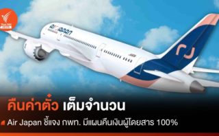 Air Japan ชี้แจง กพท.มีแผนคืนเงินค่าบัตรโดยสารกรณียกเลิกเที่ยวบินวันที่ 22 ก.พ. เต็มจำนวน ระบุสาเหตุมาจากความล่าช้าของเที่ยวบินขาเข้า (นาริตะ-สุวรรณภูมิ)